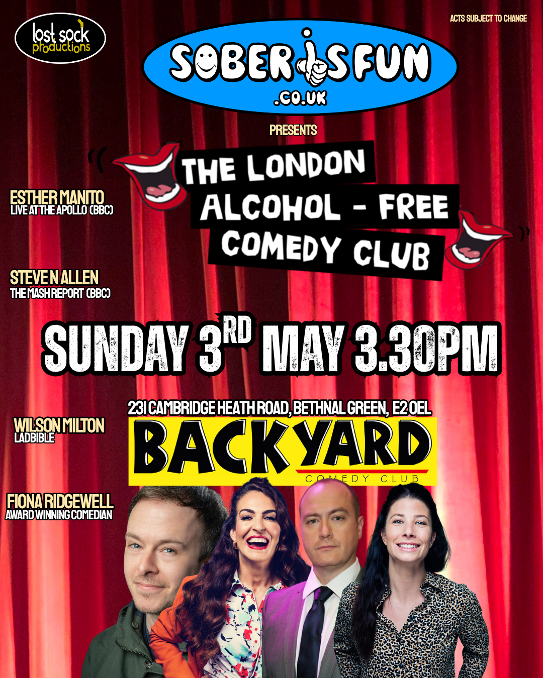 This London Alcohol-Free show at BackYard Comedy Club on Sunday 3rd May 3.30pm has proven rather popular. With no work Monday, it’s a brilliant afternoon out on a Sunday afternoon in London.