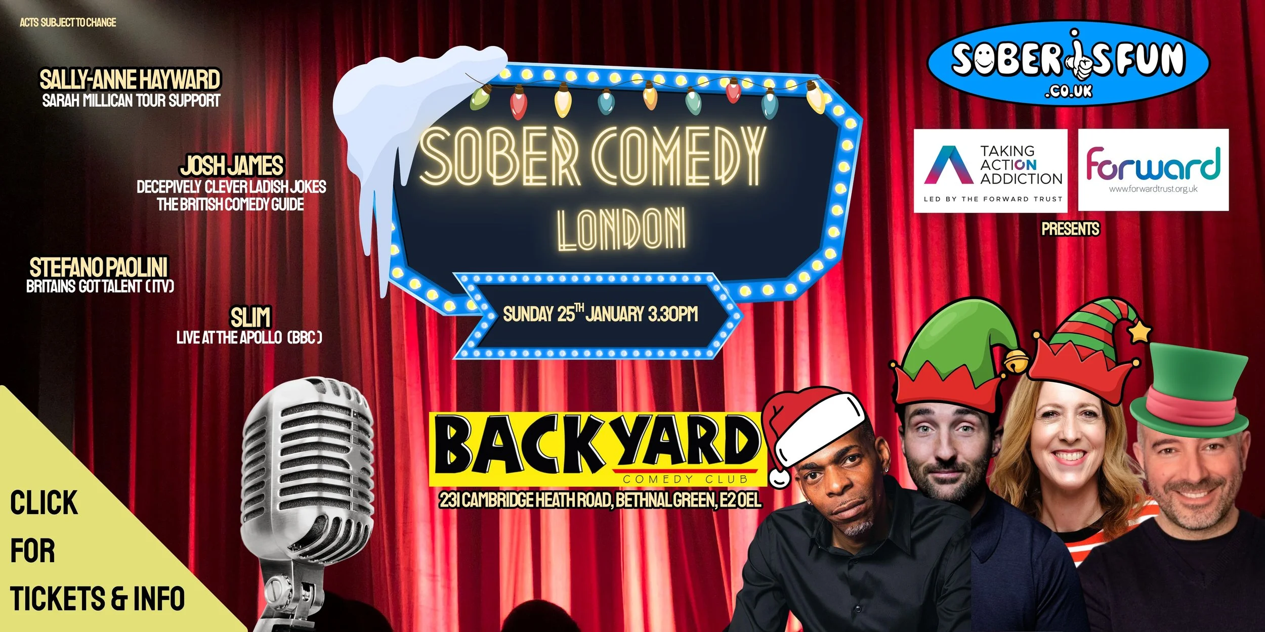 Come join us on Sunday 25th January 3.30pm at Backyard Comedy Club in Bethnal Green for this BIG London sober event.